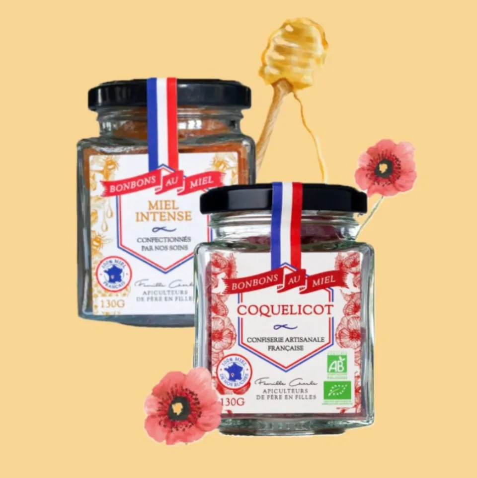 Régalez-vous avec les bonbons gourmands au bon goût de miel de l’entreprise familiale « Les abeilles de Malescot ». Chacune de leurs recettes de bonbons contient 20% du bon miel de nectar bio soigneusement récolté dans le Lot-et-Garonne. Découvrez notre sélection de deux parfums : miel intense et coquelicot.