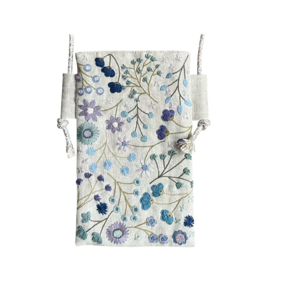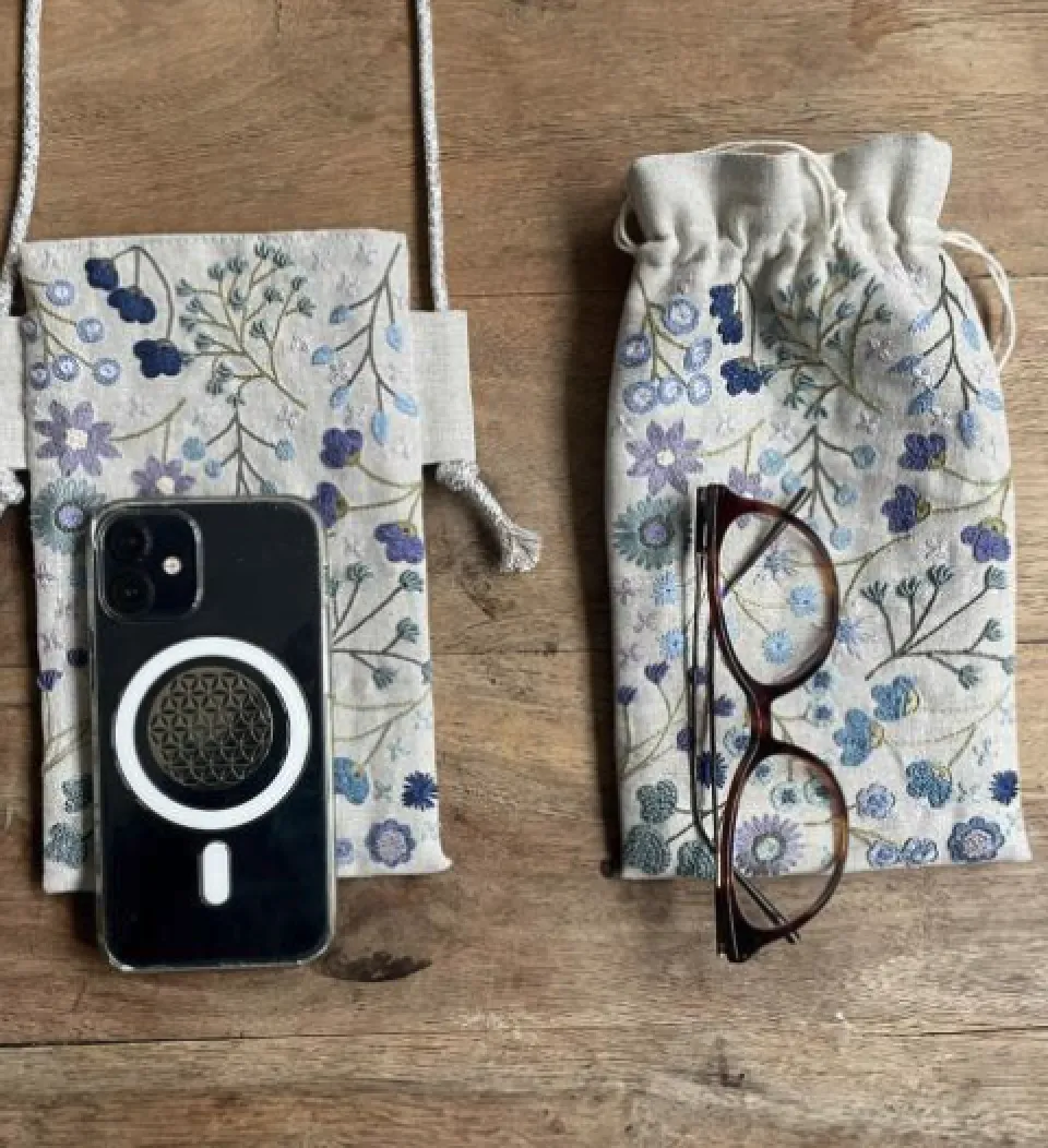 Vous trouverez dans ce kit, tout le nécessaire pour réaliser soit un étui à lunettes, soit une pochette pour téléphone portable. Seul le recto de la pochette est brodé.
