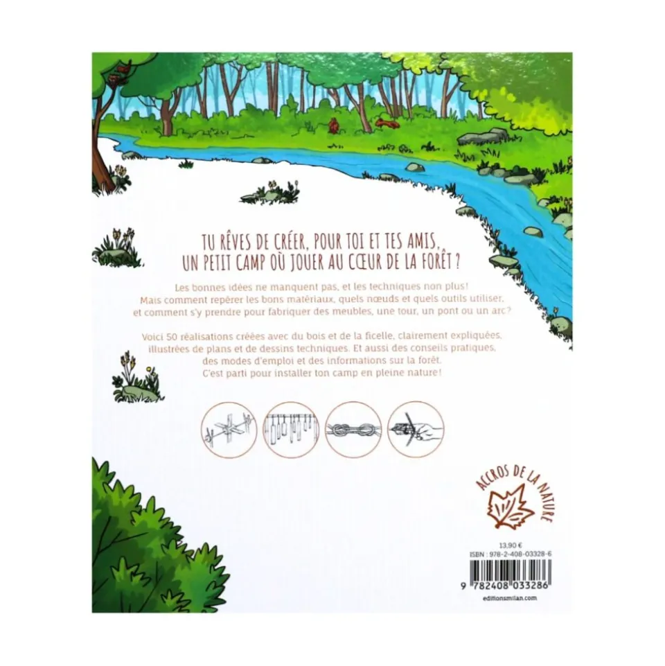 Quel enfant n’a pas rêvé d’installer son camp au cœur de la forêt ? Apprendre à choisir le bon emplacement, à récolter les matériaux adéquats, à aménager l’intérieur de son coin de verdure : sièges, tables, hamac, stores… Avec 50 réalisations clairement expliquées, illustrées de plans et de dessins techniques, ce livre mêle conseils pratiques, modes d’emploi et informations sur la forêt. Richement illustré, il donne immédiatement envie d’aller s’installer et de jouer en pleine nature !