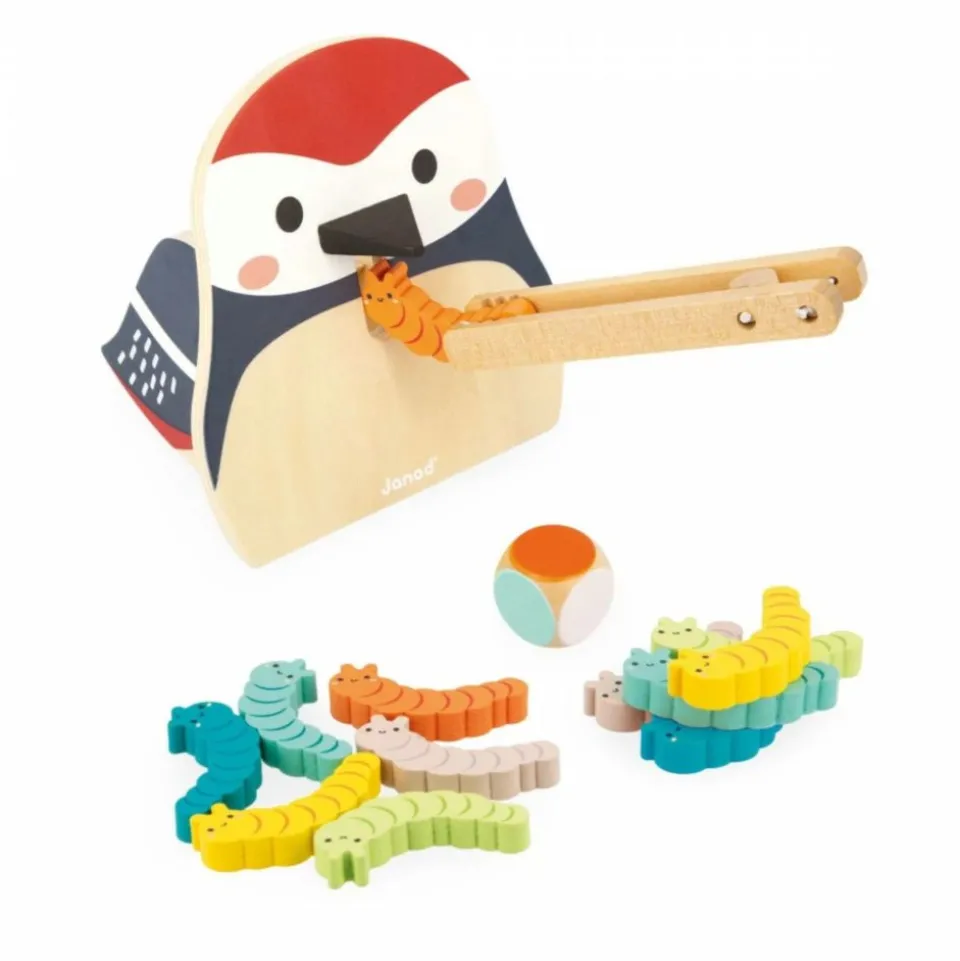 C’est l’heure de la becquée pour notre gourmand pic épeiche ! Et c’est aux enfants de le nourrir avec attention ! Une chenille verte, une chenille orange ? Qu’est-ce que ce bel oiseau va réclamer ? Pour le savoir, on lance le dé qui va déterminer la couleur du vers et il faudra jouer de dextérité pour attraper le bon avec la pince en bois pour le placer dans le bec de l’animal. Le premier à donner toutes les chenilles de son jeu a gagné ! Le bac de rangement à l’arrière de l’oiseau permet de stocker toutes les chenilles. Ce jeu pour les enfants à partir de 2 ans est idéal pour développer la motricité fine ainsi que la mémoire visuelle grâce à la reconnaissance des couleurs. Jouet en bois certifié FSC® (bois issu de forêts gérées durablement).