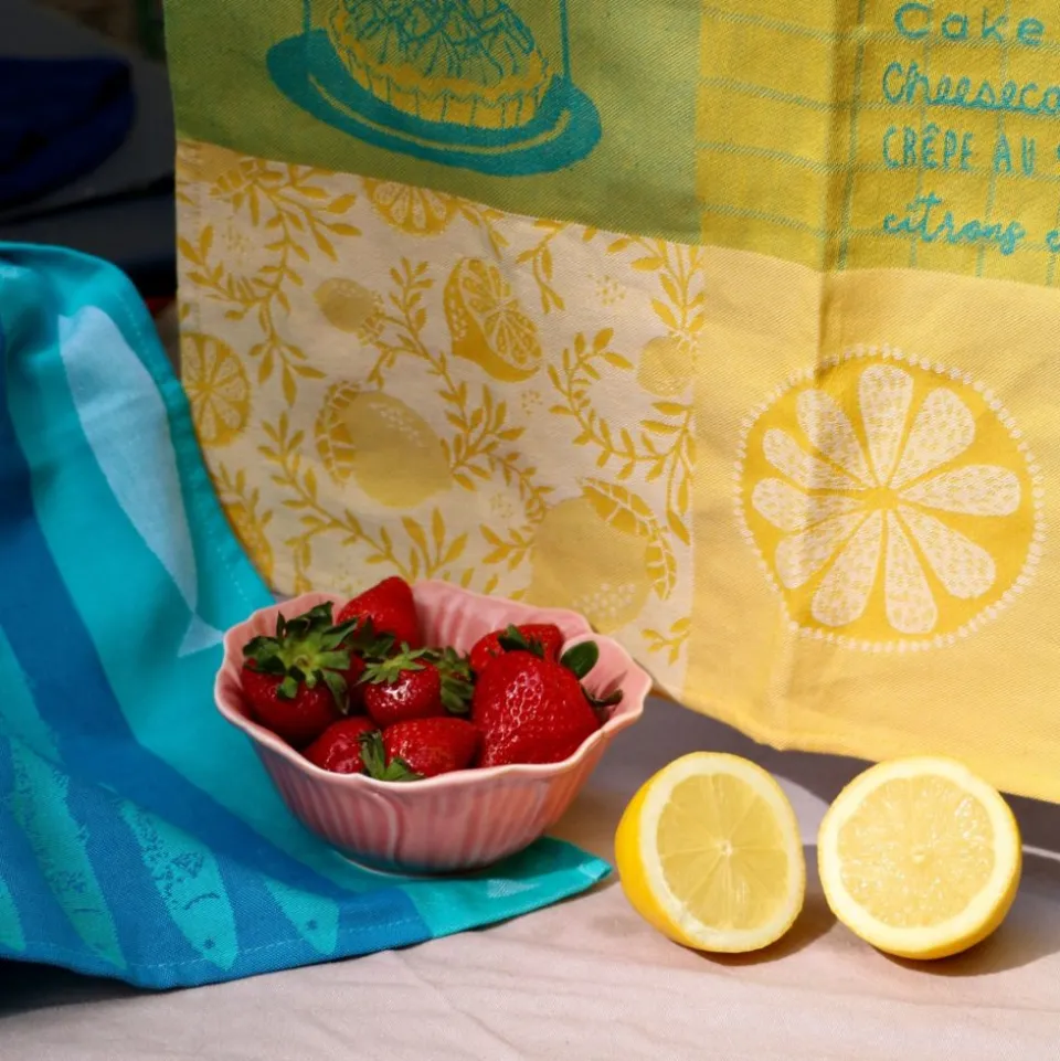 - Le torchon « Citrons verts », création Tissage Moutet, apporte une touche acidulée à la cuisine, avec de très belles couleurs vertes et sa pulpeuse couleur jaune. Votre intérieur est vitaminé !