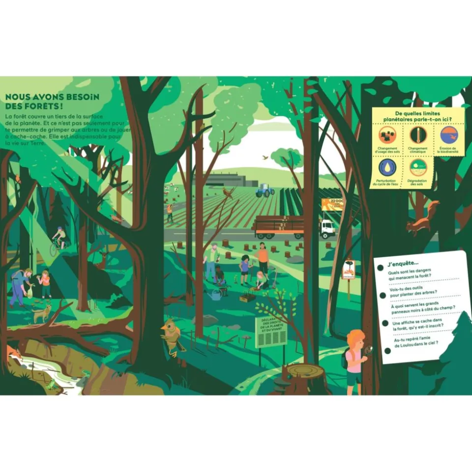Tu t’es peut-être un jour demandé à partir de combien de forêts coupées les animaux sont en danger ? Ou combien de produits chimiques la planète peut supporter ? Une équipe internationale de chercheurs et de chercheuses a répondu à toutes ces questions ! Avec Camille et Loulou, toi aussi, mène l’enquête sur les ressources et les limites de la planète. Et découvre tout ce que tu peux faire pour la préserver.