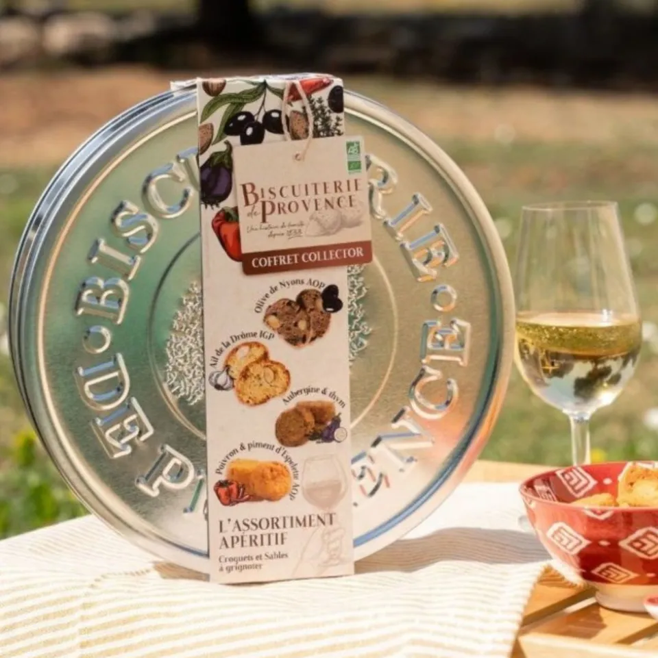 Craquez pour notre Boîte métal Assortiment Apéritif ! Retrouvez dans cet assortiment vos recettes préférées de croquets et sablés : Croquets aux olives de Nyons AOP, nos Croquets Ail de la Drôme IGP, Sablés BIO Poivron & Piment d’Espelette AOP et nos Sablés BIO Aubergine & Thym dans ce coffret cadeau prêt à offrir