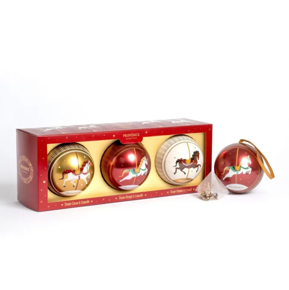 Ce coffret contient 3 boules de Noel métal chacune renferme une saveur de tisane différente. À déguster et