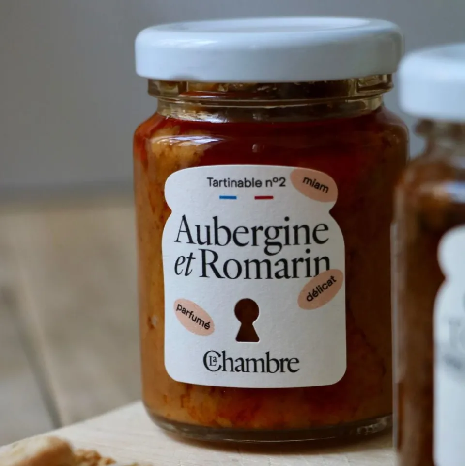 - Tartinade Aubergine & Romarin : Aubergine 32%. poivron rouge. huile d’olive. tomate. vinaigre balsamique (vinaigre de vin rouge. môut de raisins concentré. colorant : caramel au sulfite d’ammonium. conservateur :disulfite de potassium). citron. sel. ail. romarin 0.2%. poivre.