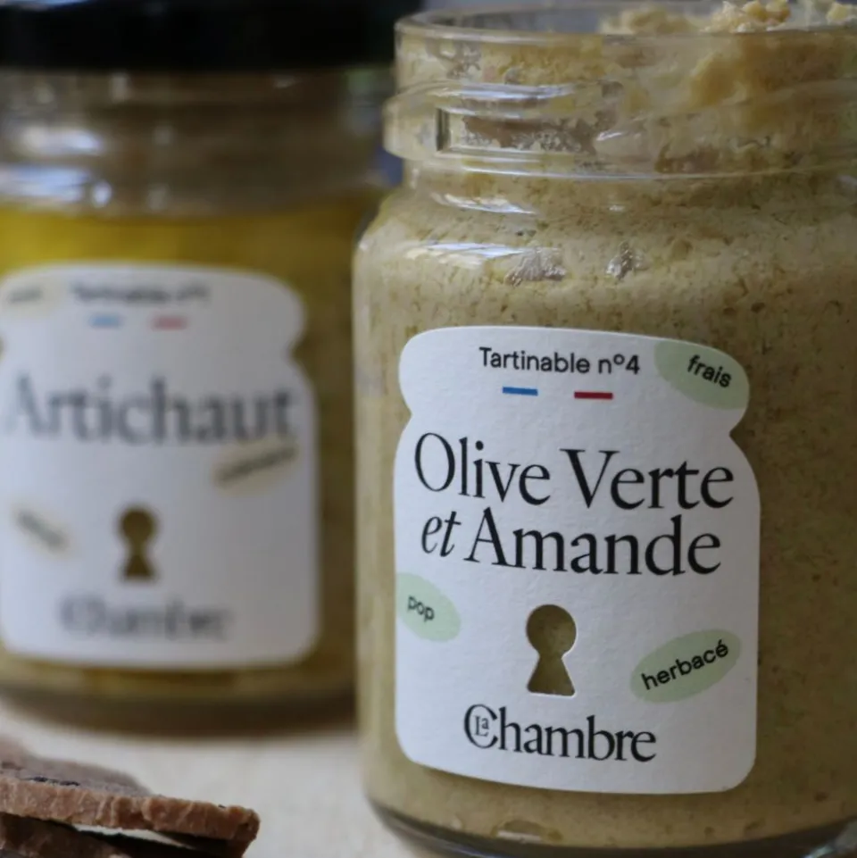 - Tartinade Olive Verte & Amande : Olive verte 49% (olive verte dénoyautées 96%. sel). huile d’olive. amande ( fruits a coques) 15%. citron.