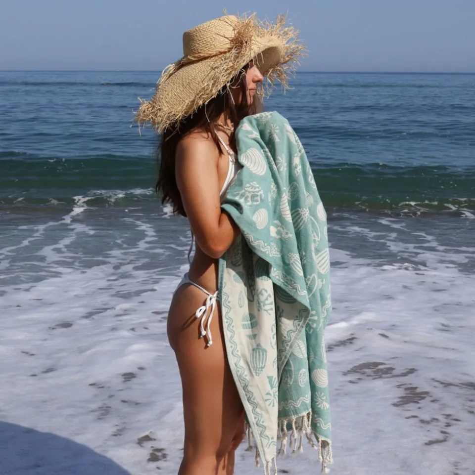Évadez-vous avec la fouta Rivage Spiruline, confectionnée en 100% coton et sublimée par un bleu-vert spiruline délicatement teinté de jaune, rappelant les eaux chaudes de l’été et les trésors sous-marins.