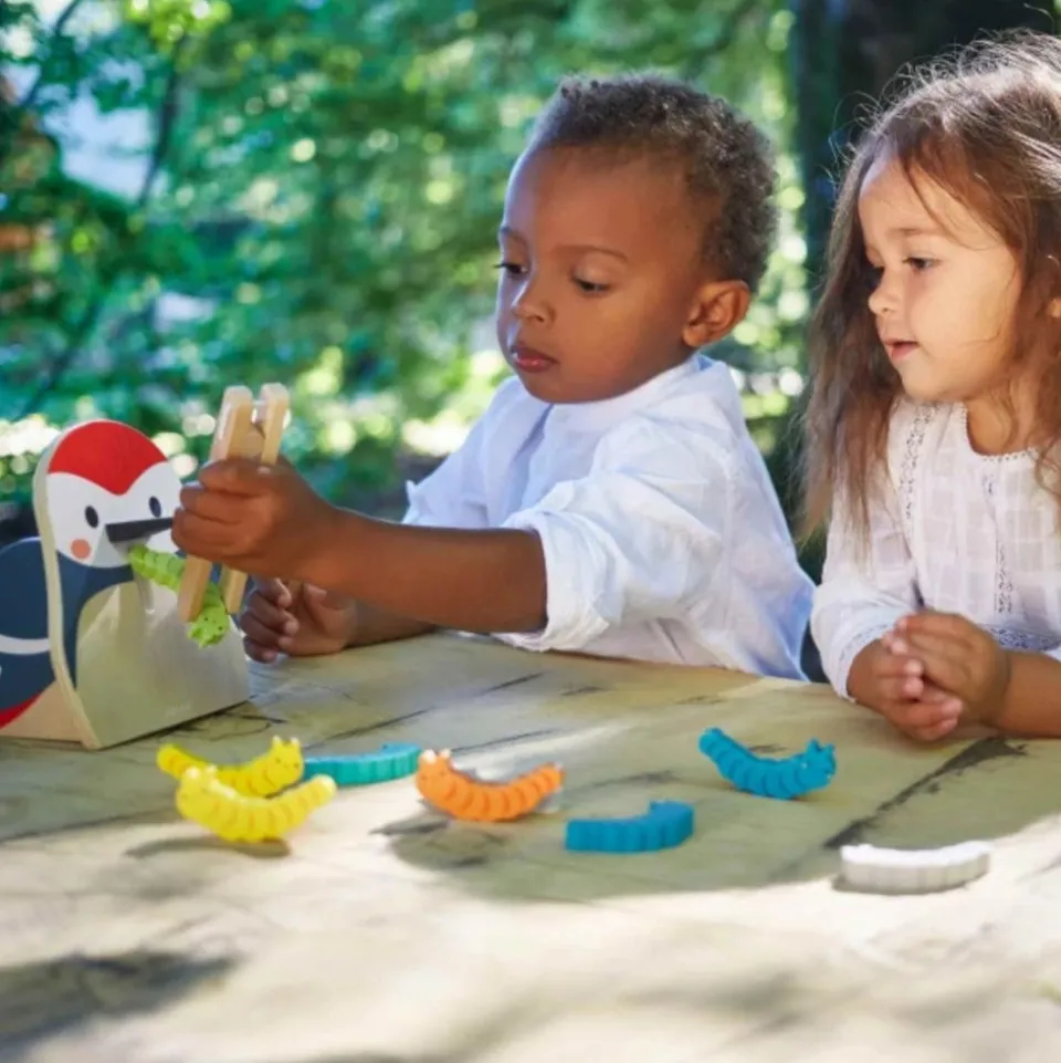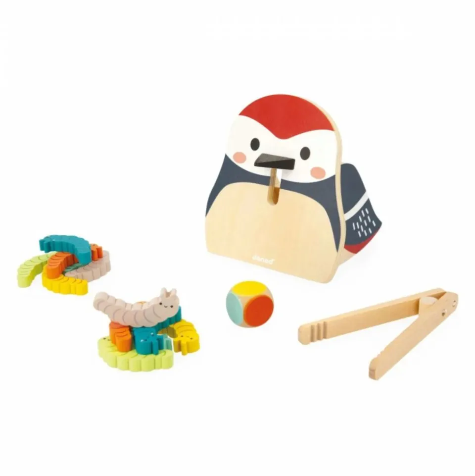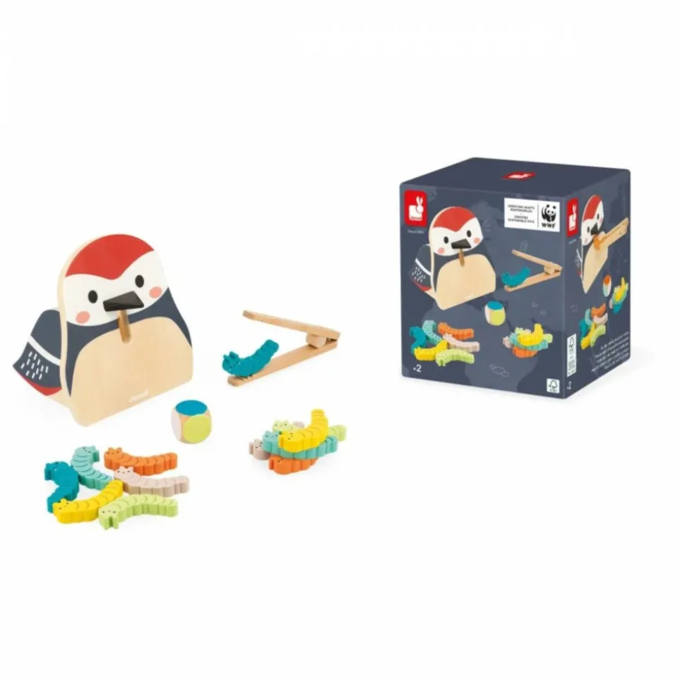 C’est l’heure de la becquée pour notre gourmand pic épeiche ! Et c’est aux enfants de le nourrir avec attention ! Une chenille verte, une chenille orange ? Qu’est-ce que ce bel oiseau va réclamer ? Pour le savoir, on lance le dé qui va déterminer la couleur du vers et il faudra jouer de dextérité pour attraper le bon avec la pince en bois pour le placer dans le bec de l’animal. Le premier à donner toutes les chenilles de son jeu a gagné ! Le bac de rangement à l’arrière de l’oiseau permet de stocker toutes les chenilles. Ce jeu pour les enfants à partir de 2 ans est idéal pour développer la motricité fine ainsi que la mémoire visuelle grâce à la reconnaissance des couleurs. Jouet en bois certifié FSC® (bois issu de forêts gérées durablement).