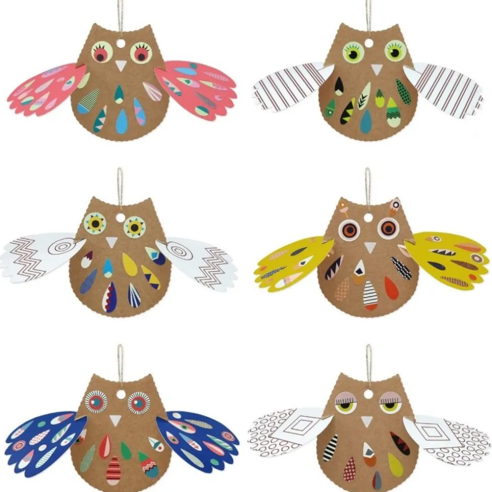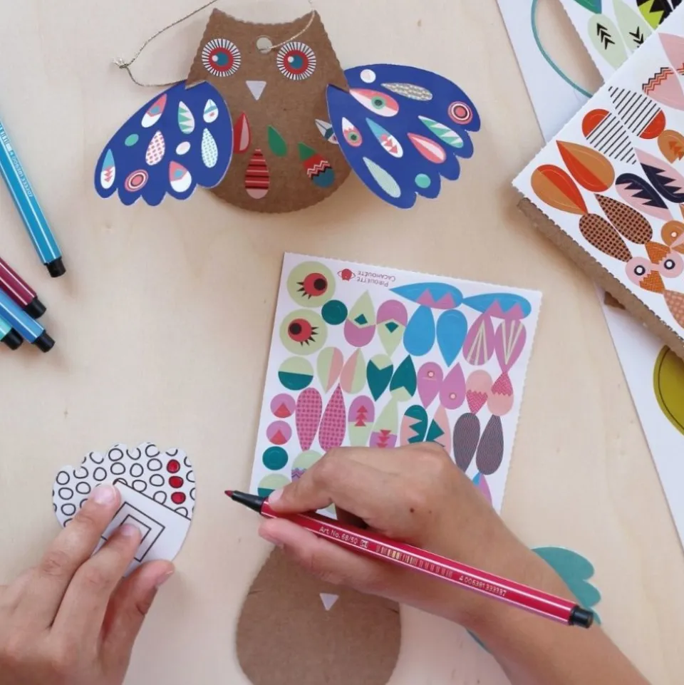 Cette activité, sans colle ni ciseaux, débute par l’assemblage simple du papier et du carton pour donner vie à 6 adorables petites chouettes au style arty. Chaque enfant pourra ensuite s’amuser à personnaliser la sienne à l’aide de stickers pour les plumes, et les yeux. Les plus créatifs pourront également décorer les chouettes à l’aide de peinture, de feutres…