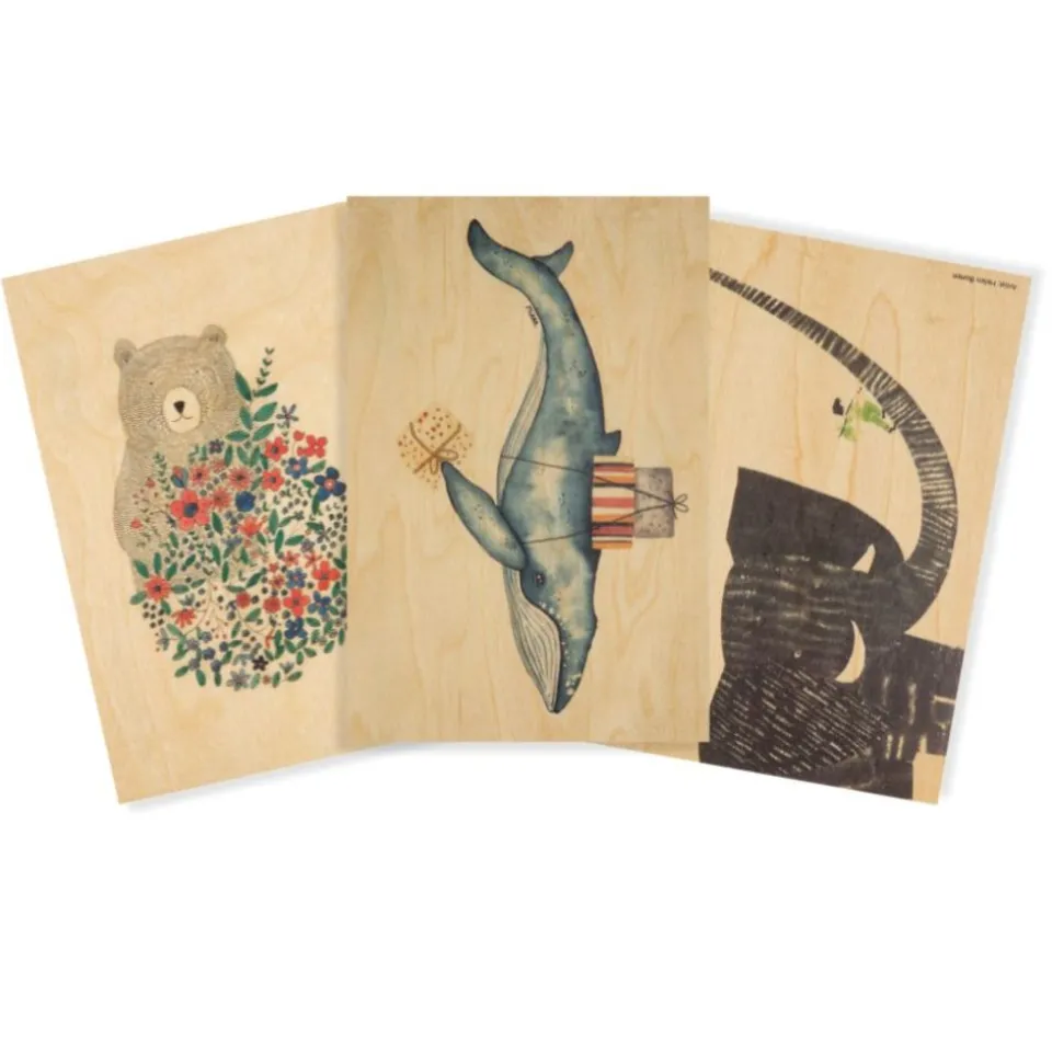 Ce lot de trois cartes postales en bois massif est fabriqué en France, dans l’usine située dans le Jura.