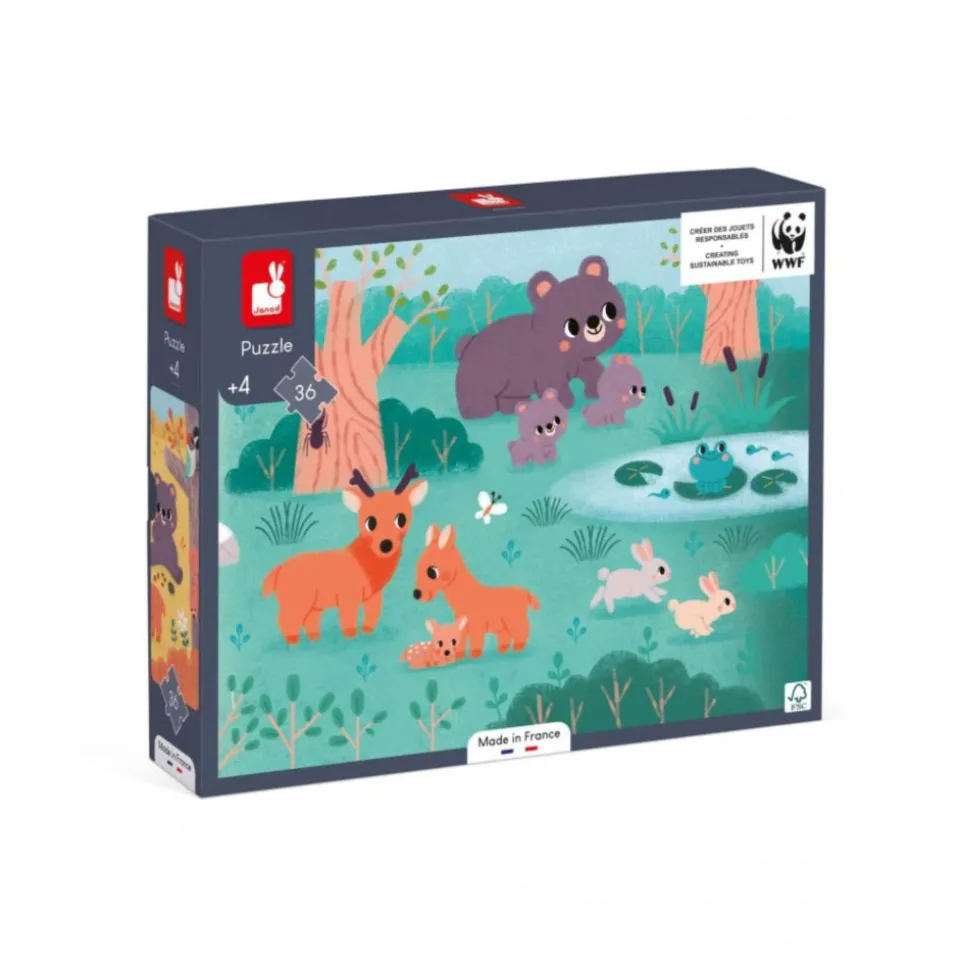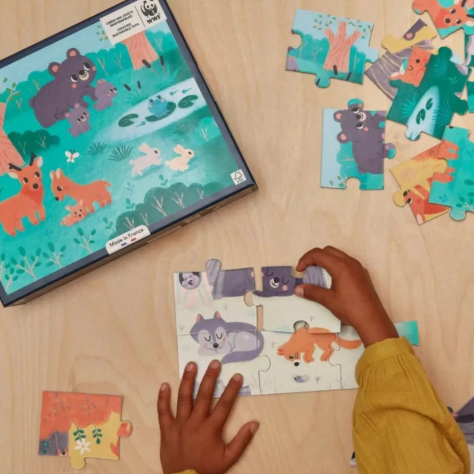 C’est parti pour la découverte de la vie de nos animaux sauvages préférés au fil des saisons ! Laissez les enfants découvrir pas à pas un univers de douceur grâce à ce joli puzzle panoramique de 36 pièces ! Une fois terminé, ce jeu de concentration en carton certifié FSC® mixte (bois issu de forêts gérées durablement) et fabriqué en France avec des encres végétales, mesure 1 mètre de long et permet de se plonger dans la vie de la forêt en hiver, printemps, été et enfin automne ! Un bon moyen pour les enfants dès 4 ans de s’imprégner des particularités de chaque saison tout en assouvissant leur passion pour les puzzles. Ce puzzle permet de développer la concentration, la logique, mais également la dextérité grâce à de grosses pièces adaptées aux petites mains. Un poster permettra d’aider les enfants lors des premières réalisations. Familles loups, ours et lapins attendent les petits pour l’exploration ! Ce jouet est développé en collaboration avec WWF.